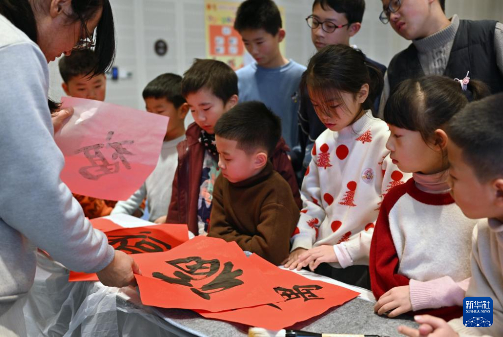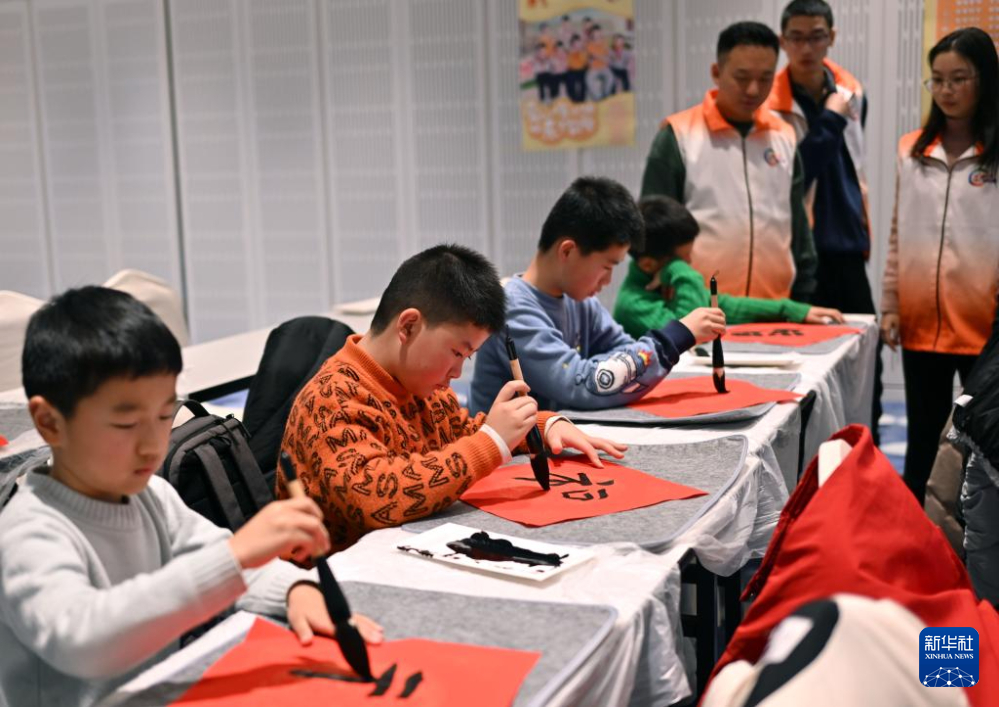 1月31日,在书法课,寒托班的同学们在写福字。
