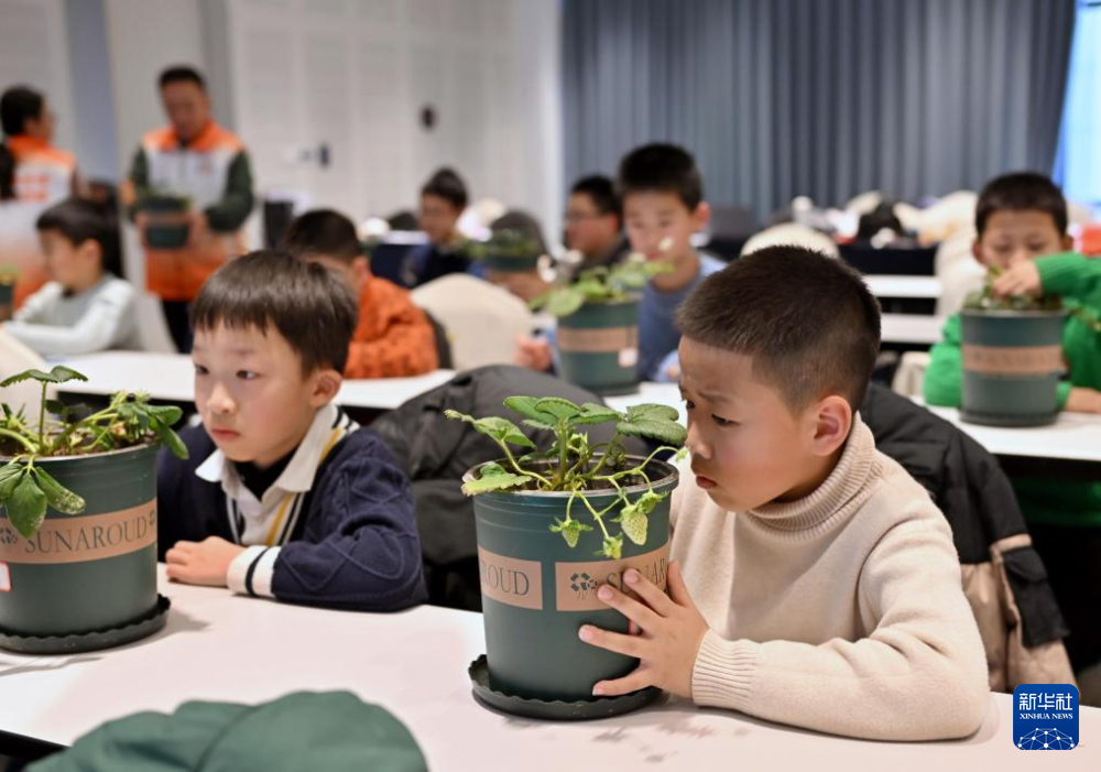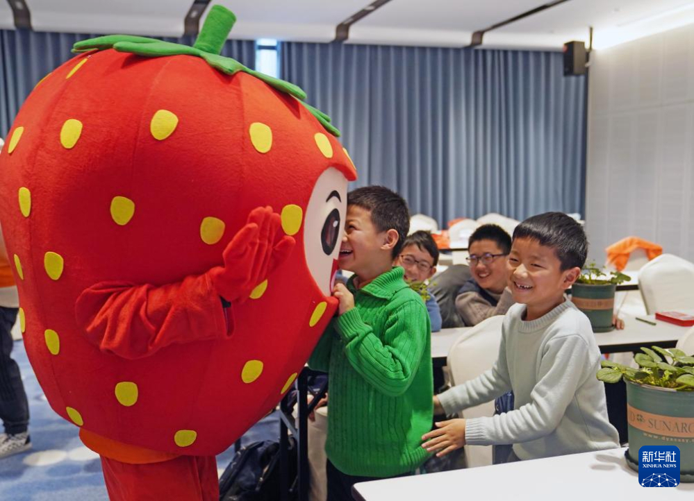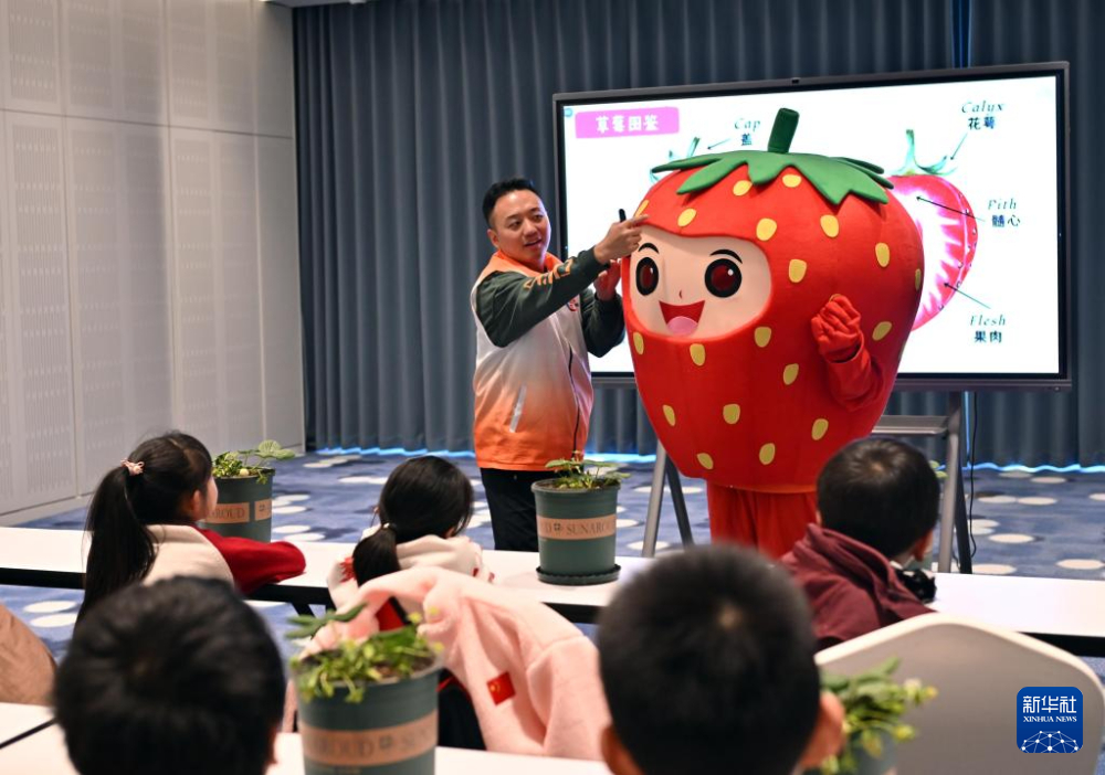 1月31日,在自然启蒙课上,志愿者引导寒托班的同学们了解草莓的生物学特征。