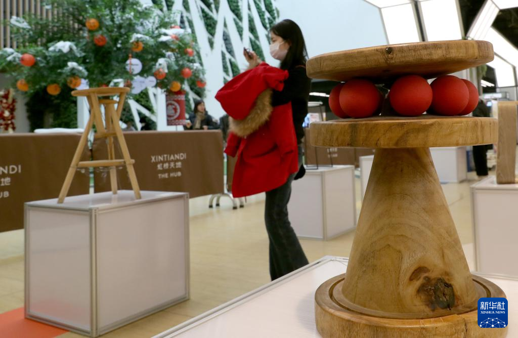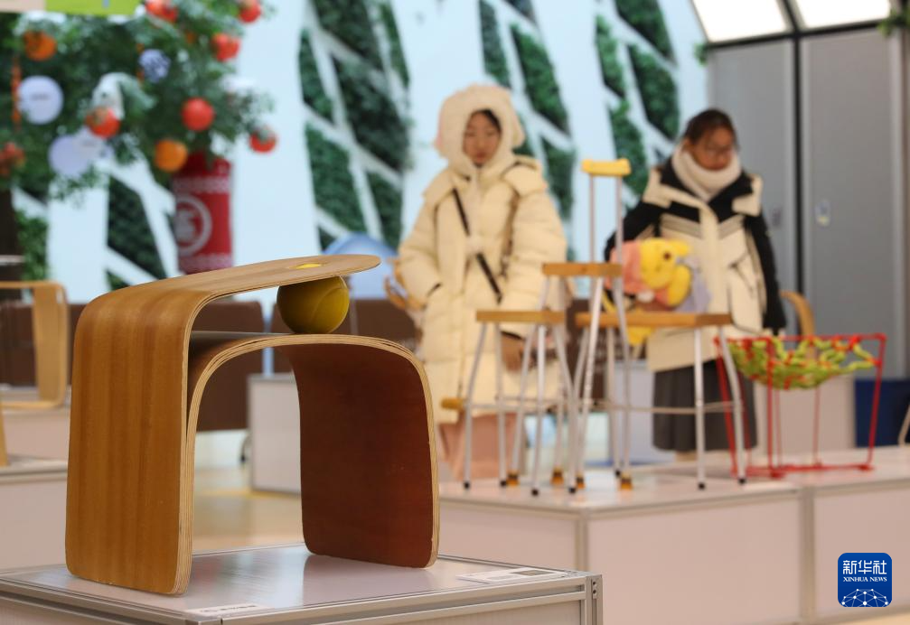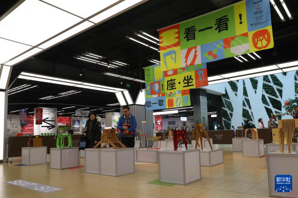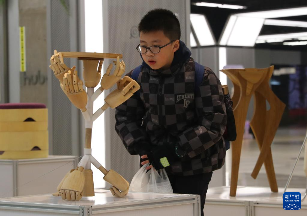2月6日,小朋友在驻足观看一个创意座椅展品。