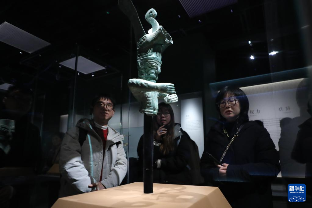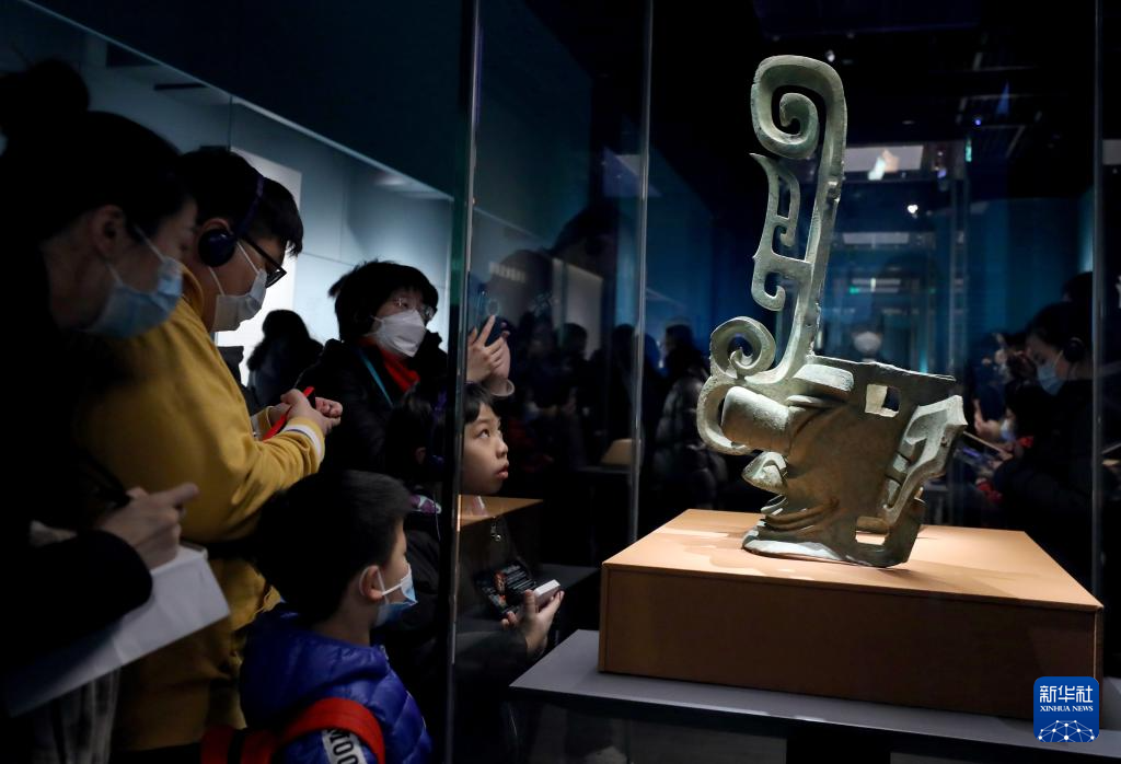 2月10日,在上海博物馆东馆举办的“星耀中国 三星堆·金沙古蜀文明展”上,参观者在商代兽首冠青铜人像展品前驻足观看。
