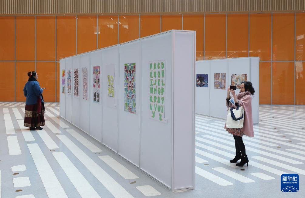2月10日,参观者在上海图书馆东馆举办的龙年生肖艺术展上观看参展的龙年主题绘画作品。