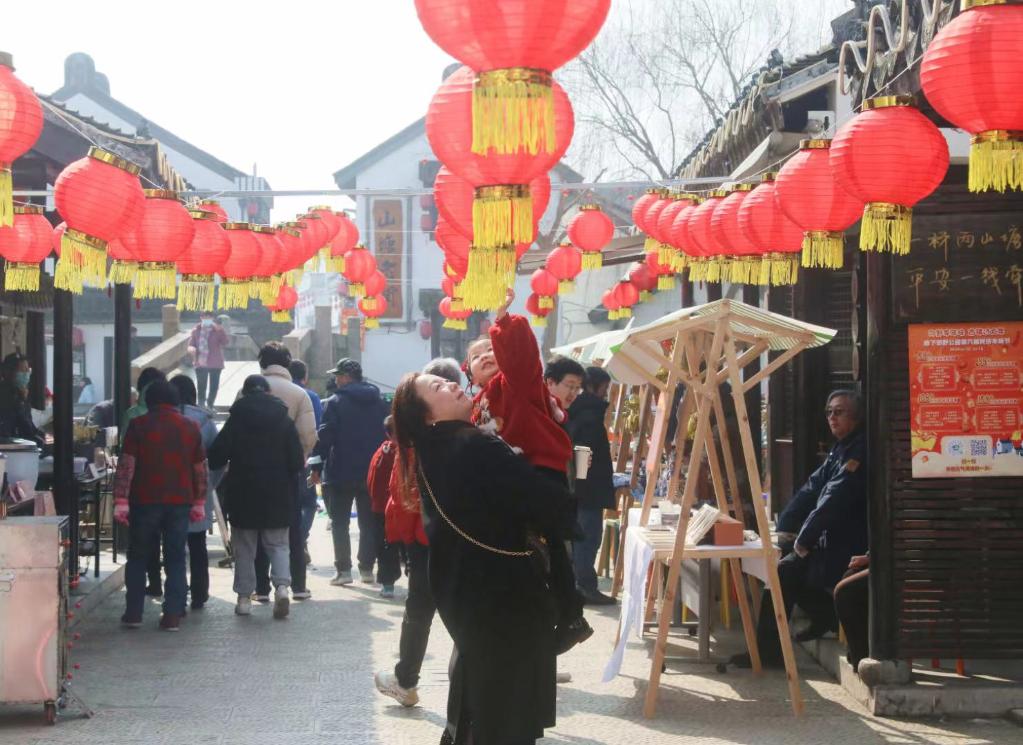 新华网上海2月11日电(李荣 沈赞贤)糖饺、油墩子、阿婆菜饭,年画、剪纸、土布挂件,滚铁环、翻洋片、扔沙包……新年伊始,在沪郊廊下山塘老街,一排排大红灯笼高高挂起,一个个民俗摊位前人头攒动,将春节的节日氛围装点得分外红火、热闹。来自沪浙毗邻两地的村民们,穿梭在山塘老街的集市上畅玩古镇、畅享美食,共同迎接龙年的到来。