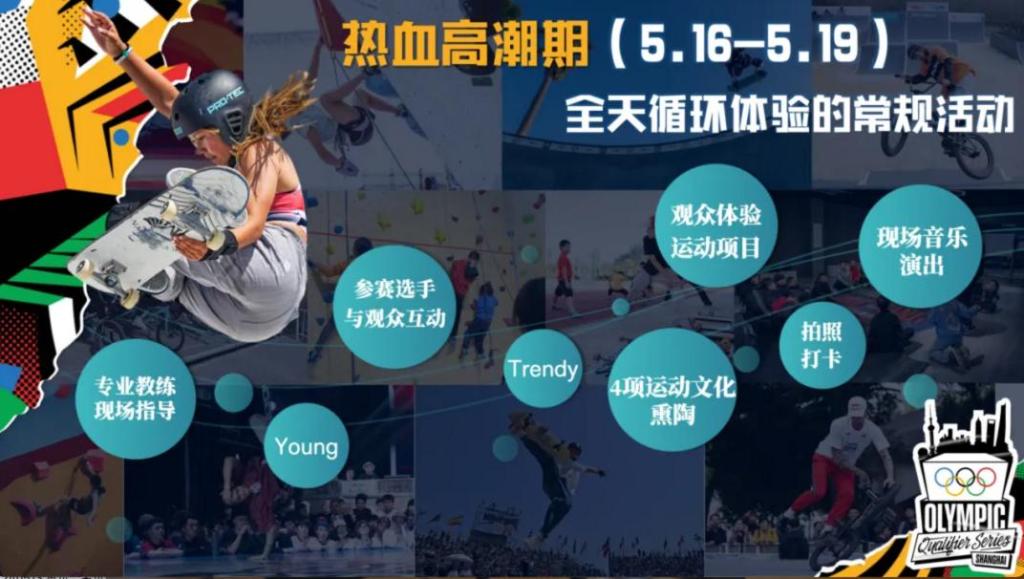 此外,赛前及赛事期间还将在黄浦滨江滑板公园举办运动启蒙活动,向青少年普及霹雳舞、攀岩、滑板和自由式小轮车项目,并举办小型赛事,为奥运会资格系列赛预热。