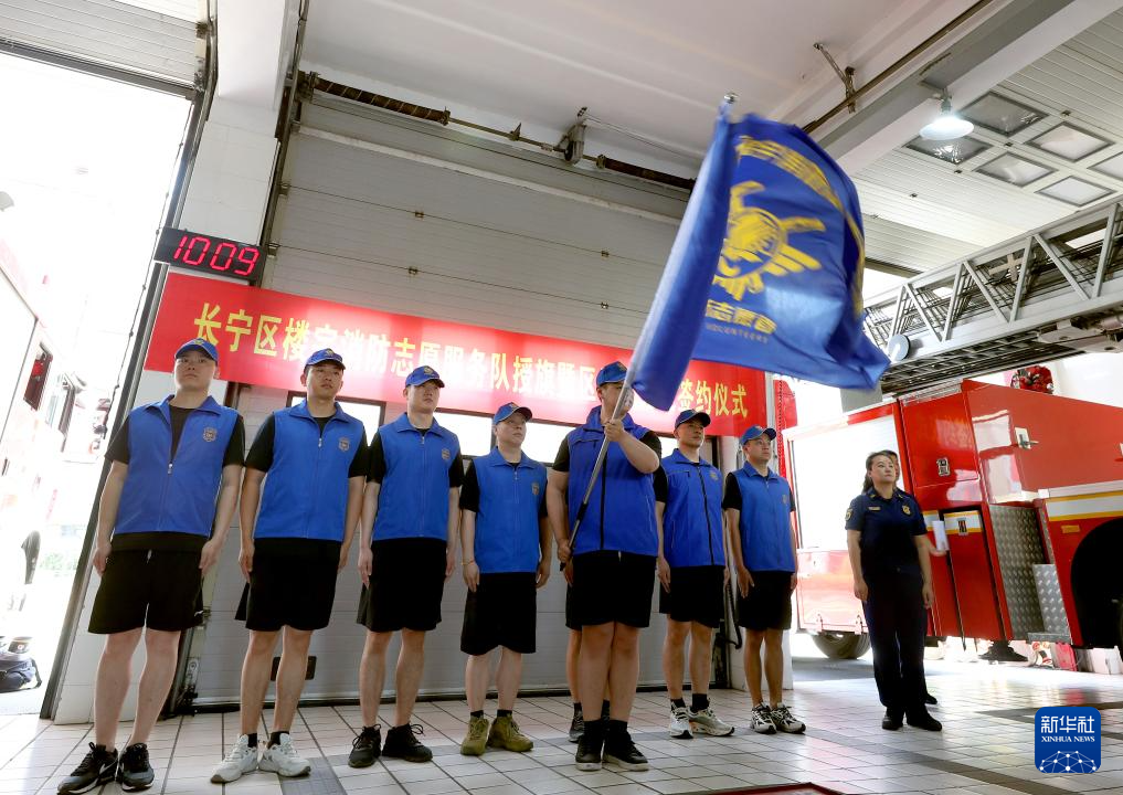 7月16日,“长宁区楼宇消防志愿服务队”代表在授旗仪式上挥动队旗。