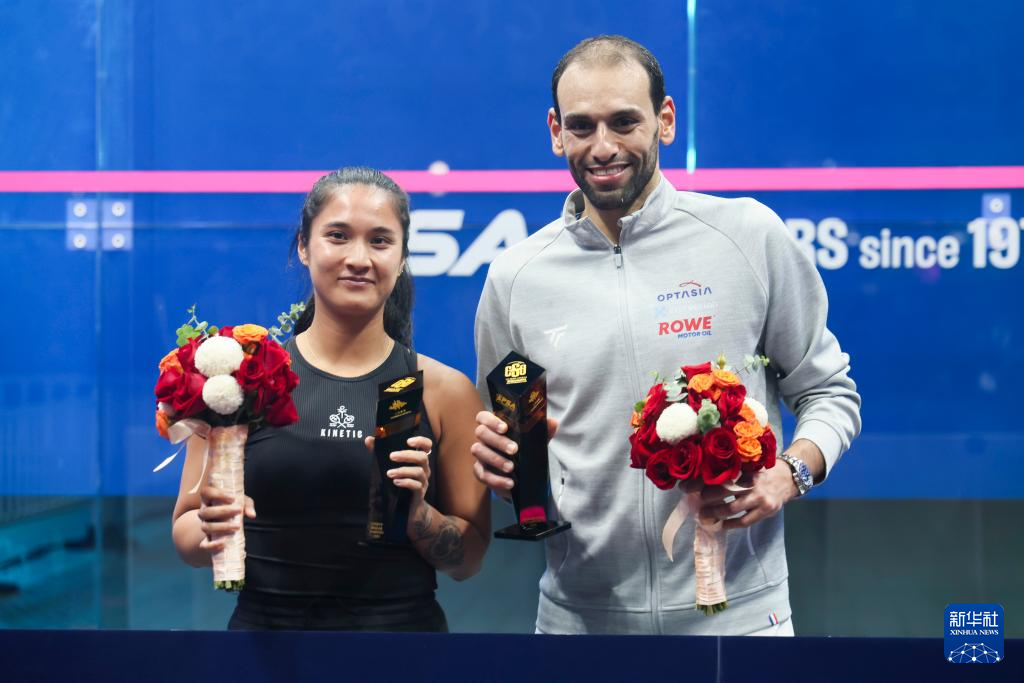 11月3日,男单冠军英格兰选手穆罕默德·艾尔舒巴基(右)和女单冠军马来西亚选手蕾切尔·阿诺德在颁奖仪式上。