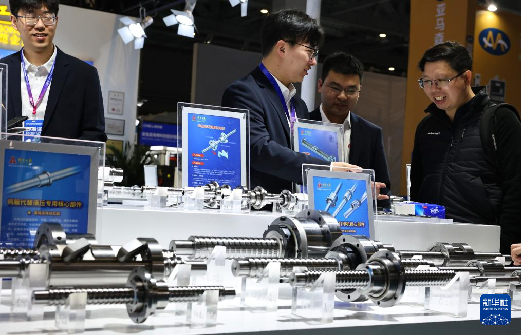 3月3日,参观者(右一)在一个机床核心零部件产品展台前与工作人员交流讨论。