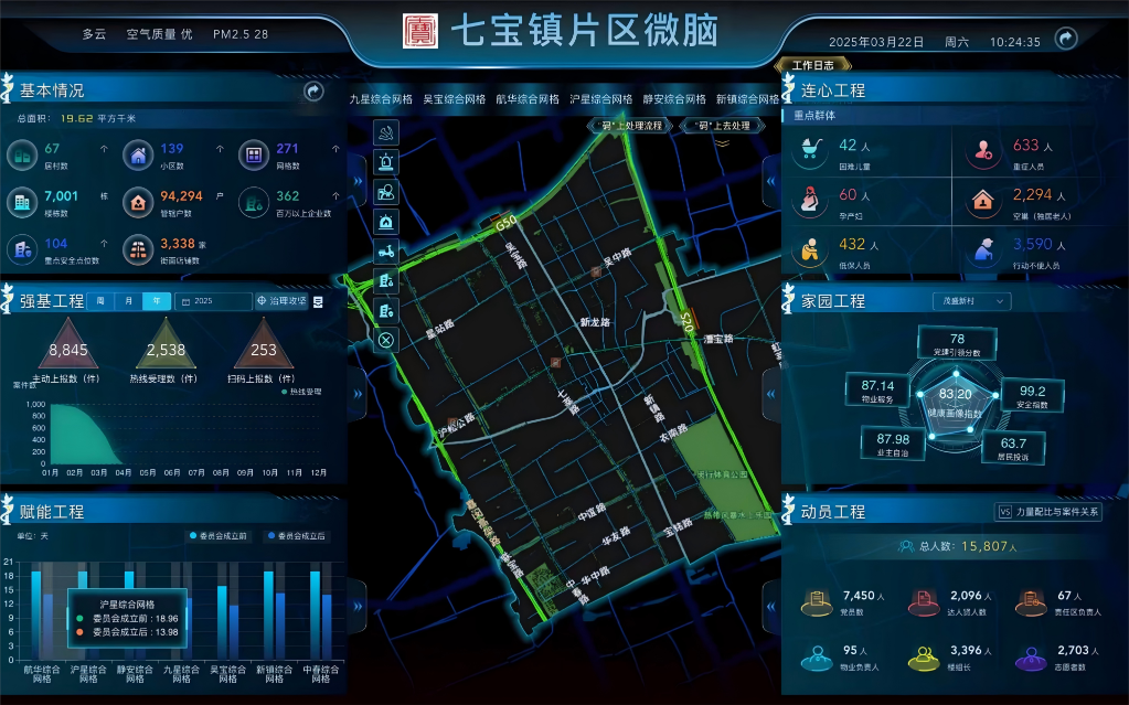 “过去我们主要依靠‘人海战术’摸排问题,现在数据多跑路、干部少跑腿,治理变得更精准高效。”七宝镇分管副镇长刘钧介绍,“片区微脑”围绕党建引领基层治理“六大工程”,通过大数据技术实现了党建、服务、治理等多元资源的智能汇聚和研判分析。