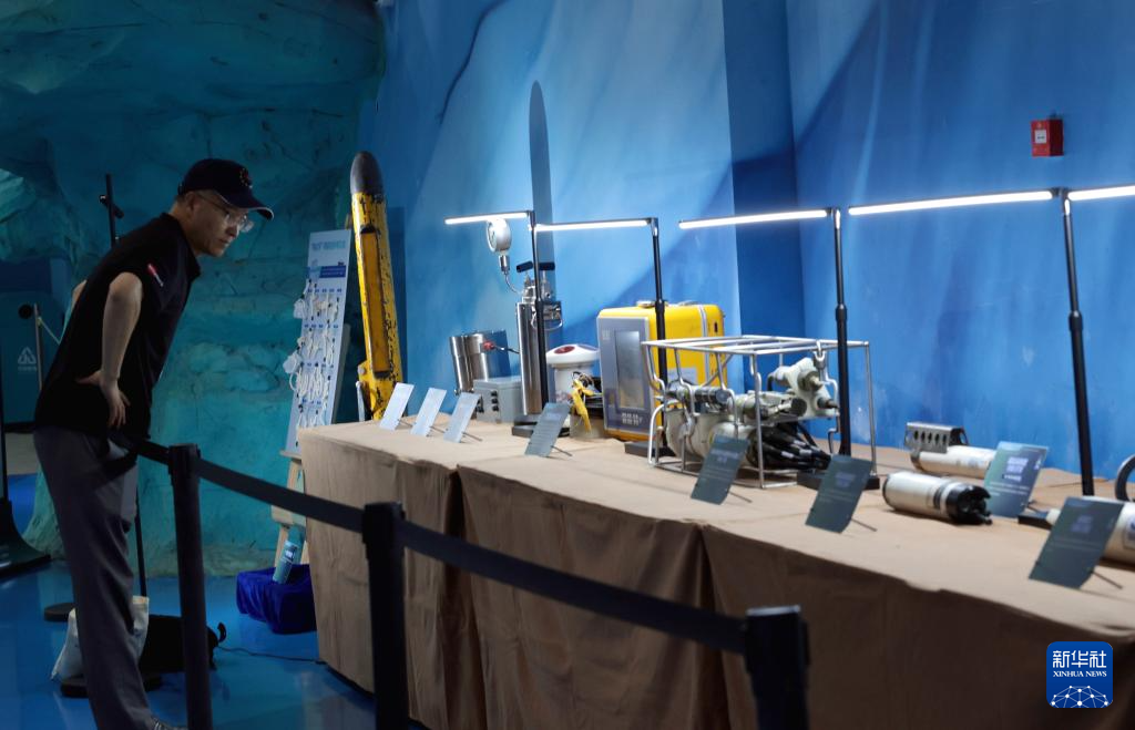6月7日,参观者在一组海洋探测仪器展品前驻足观看。