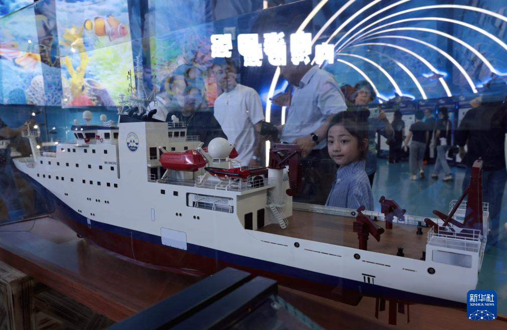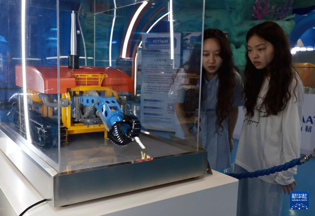 6月7日,参观者在多金属硫化物深海采矿车模型前驻足。