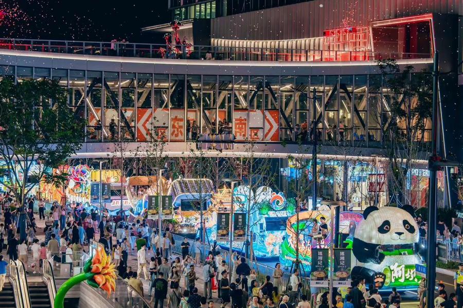 夜幕降临,第36届上海旅游节25辆花车流光溢彩,缓缓驶过位于徐汇区的鑫耀·光环Live商圈。草地上《浪浪山小妖怪》里的“小猪妖”气模装饰与四川阿坝州花车上的“大熊猫”、上海野生动物园花车上的“狮子王”等相映成趣,吸引正在此锻炼的上海市民方雪驻足拍照,大呼“好看!”