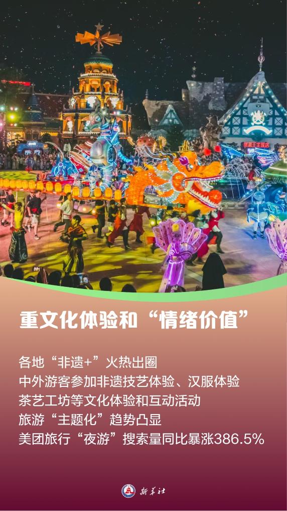 人们假日文旅消费更注重文化体验和“情绪价值”。中外游客在游览经典目的地之余,还积极参加非遗技艺体验、汉服体验、茶艺体验等文化活动,各地“非遗+”火热出圈。旅游“主题化”趋势也更加凸显。美团旅行数据显示,“夜游”搜索量同比暴涨386.5%。