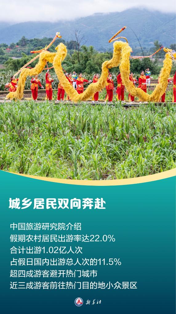城乡居民正在“双向奔赴”。中国旅游研究院介绍,一方面,假期农村居民出游率达22.0%,合计出游1.02亿人次,占假日国内出游总人次的11.5%。另一方面,超四成游客选择“避开热门城市、选择去人少的城市”,近三成游客选择“热门目的地小众景区”。同程旅行平台上,超过30个区县目的地酒店预订热度同比增长超过100%。