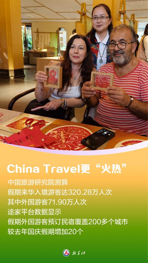 安全、有品质和便利化的“China Travel”吸引世界各国各地区的游客到来。中国旅游研究院测算,假期来华入境游客达320.28万人次,其中外国游客71.90万人次。途家平台数据显示,假期外国游客预订民宿覆盖200多个城市,较去年国庆假期增加20个。