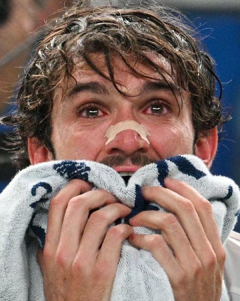 赢下比赛后,冷静的瓦舍罗终于爆发出情绪。他跪倒在场边,久久不起。有摄影师抓拍到了这动人一幕:瓦舍罗用毛巾双手捂住嘴巴,因大量消耗体能而湿透的头发下,是一双充血而含泪的眼——难以置信、惊喜……许多种复杂而细微的情绪充斥在胜利之中。