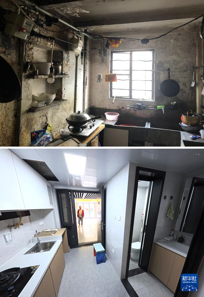 拼版照片:上图是改造前的漕溪三村小区居民共用厨房(资料照片,新华社发);下图是拆除重建后的漕溪三村小区室内独立厨房和卫生间(10月23日摄,新华社记者方喆摄)。
