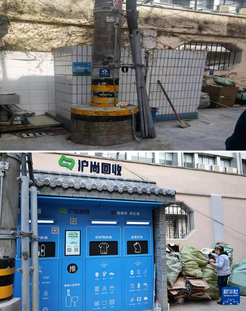 拼版照片:上图是改造前的愚园路1407弄小区内的倒粪站(资料照片,新华社发);下图是愚园路1407弄小区内由倒粪站改建成的垃圾回收站(10月23日摄,新华社记者方喆摄)。愚园路1407弄是历史风貌建筑保护小区,其采取抽户改造的方式,为居民增设独立卫生设施。