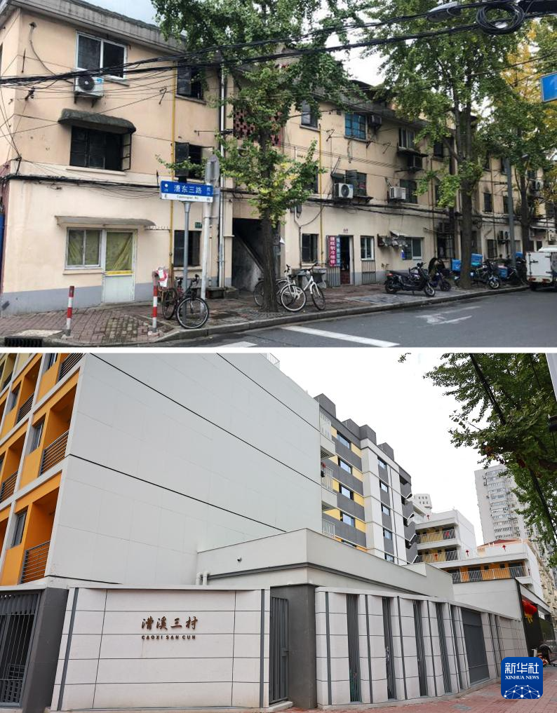拼版照片:上图是改造前的漕溪三村小区居民楼外景(资料照片,新华社发);下图是拆除重建后的漕溪三村小区居民楼外景(10月23日摄,新华社记者方喆摄)。