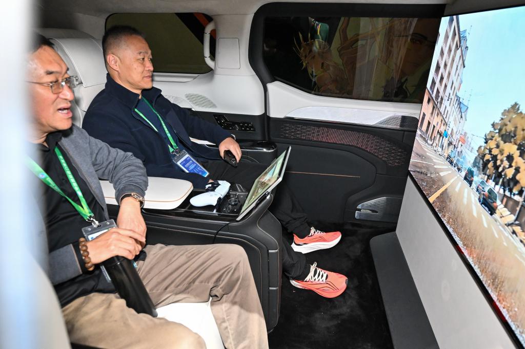 11月8日,在第八届进博会技术装备展区索尼展位,观众在沉浸式座舱内体验索尼车载娱乐系统。这款车载娱乐系统可艺术化渲染车窗外动态景观,提升乘客的出行体验。