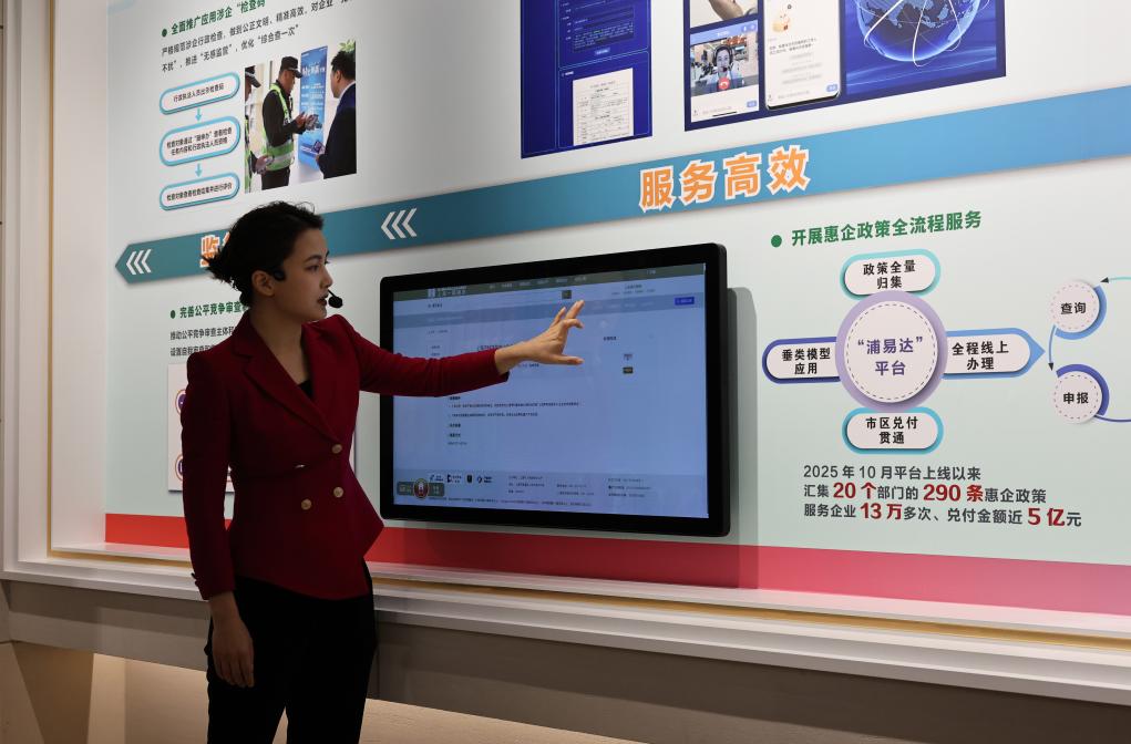 12月6日,讲解员在触控屏幕前为参观者介绍上海一网通办“浦易达”平台的功能。