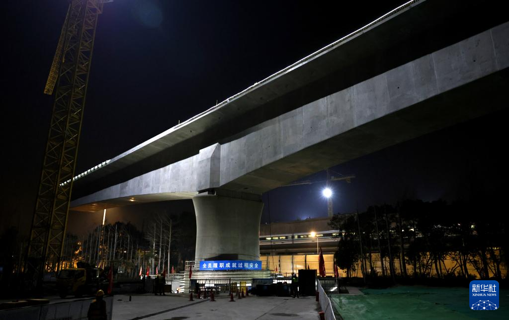 1月8日,一列磁悬浮列车(右下)从川沙特大桥跨磁悬浮连续梁转体施工现场驶过。