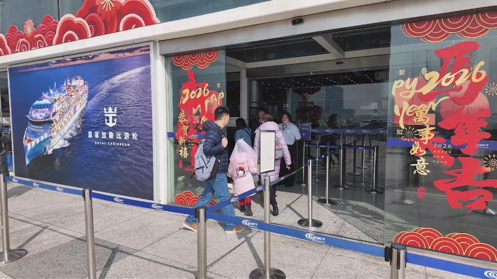 14日,上海吴淞口国际邮轮港边检查验大厅里,“海洋光谱”号邮轮的五千多名旅客陆续办理出境手续。他们启航前往韩国釜山,开启五天四晚的海上春节之旅。